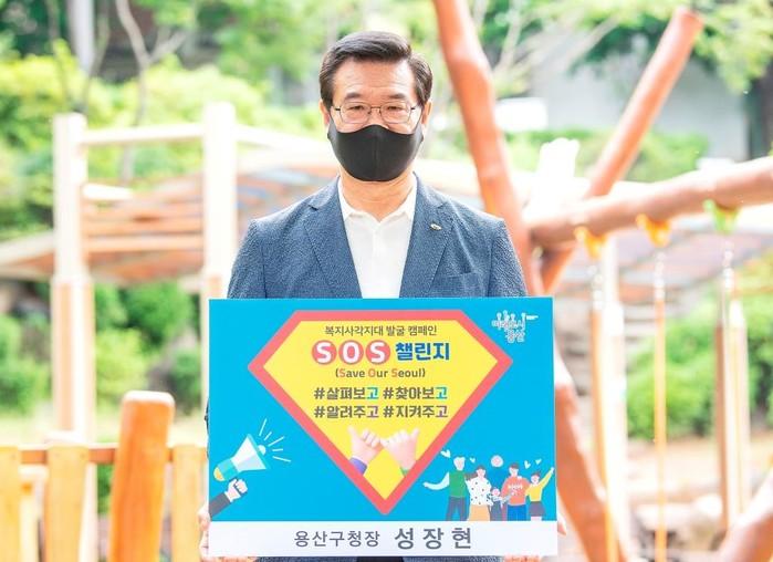 성장현 서울 용산구청장이 지난 18일 이태원 창의 어린이공원에서 ‘SOS(Save Our Seoul) 릴레이 챌린지’를 진행했다. 사진은 성 구청장이 ‘#살펴보고 #찾아보고 #알려주고 #지켜주고’라고 적힌 현판을 들고 SOS 릴레이 챌린지에 동참하고 있는 모습. (사진제공=용산구청)