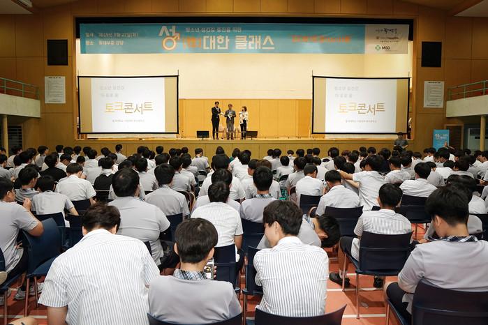 27일 서울 동대문구 동대부중 강당에서 동대문구와 서울대 보건대학원, 한국MSD 등 민·관·학이 함께 동대부중 학생 500여명을 대상으로 성 건강 토크 콘서트 ‘성대한 클래스 자유로움’을 진행했다. 사진은 토크 콘서트 진행 모습. (사진제공=동대문구청)