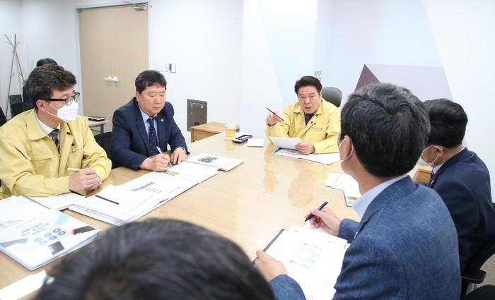 최대호 경기 안양시장이 이천 물류창고 화재와 관련해 최근 도시주택국, 도로교통국, 시설공사과, 안전총괄과 등 유관부서 실무진들을 긴급 소집해 회의를 열고 철저한 안전 점검만이 사고를 방지할 수 있다고 당부했다. 사진은 회의 진행 모습. (사진제공=안양시청)