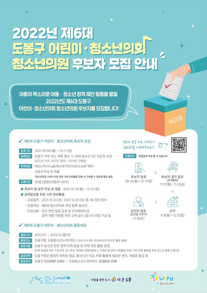 [시민일보 = 여영준 기자] 서울 도봉구(구청장 이동진)는 오는 10월17일까지 제6대 도봉구 어린이·청소년의회 의원을 모집한다고 23일 밝혔다.