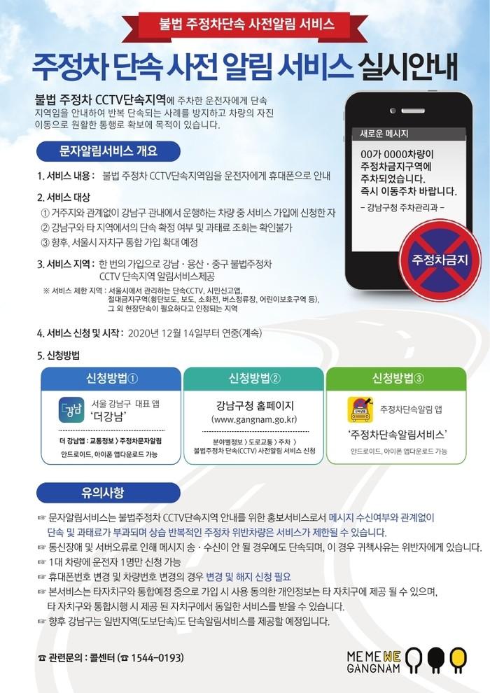 ‘불법주정차 CCTV 단속 사전알림’은 ‘더강남’, ‘주정차단속알림서비스’앱, 강남구청 홈페이지에서 사전 신청자에 한해 제공된다.