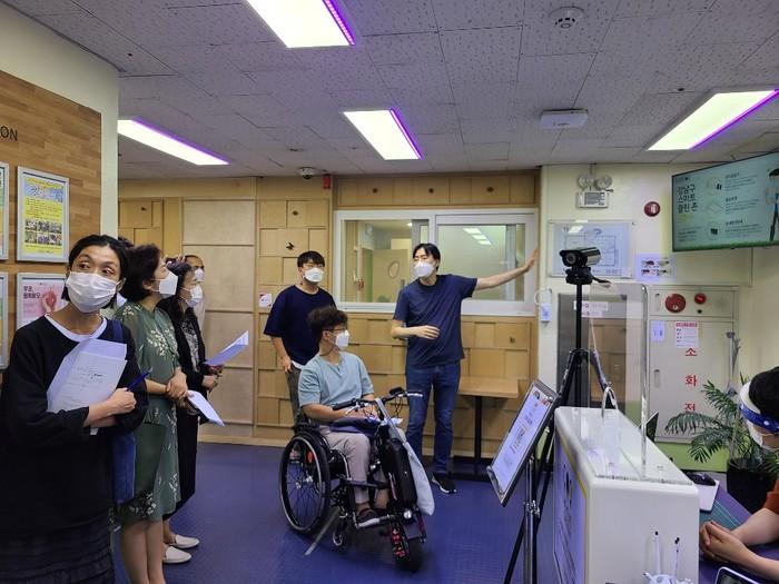 서울 강남구가 ‘구민 참여 ICT 리빙랩’ 시범사업을 통해 실내 공기환경 개선이 시급했던 개포동 강남종합사회복지관을 ‘스마트 클린존’으로 새단장했다. 사진은 관계자가 새단장한 강남종합사회복지관에 대한 설명을 하고 있는 모습. (사진제공=강남구청)