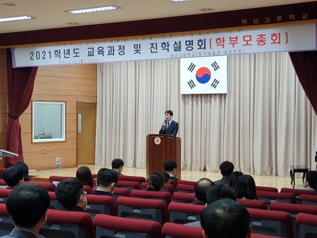[해남=정찬남 기자] 전남 해남고등학교(교장 김춘곤)는 지난 22일(월) 본교 재학생 학부모를 대상으로 교내 창의예술동 대강당에서 ‘2021학년도 학교 교육과정 설명회 및 학부모총회’를 개최했다.
