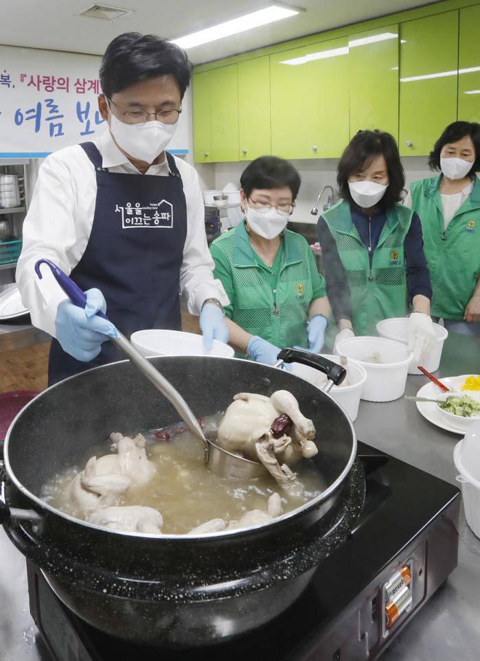 송파구가 초복을 앞두고 홀몸노인들을 위해 ‘사랑의 삼계탕’ 행사를 진행했다. 구는 지난 5일 문정마을회관 내 문정여성교실에서 ‘사랑의 삼계탕 나눔데이’를 열고 삼계탕을 직접 조리한 후 포장해 홀몸노인 20명에게 전달했다. 사진은 이날 박성수 구청장(왼쪽)이 직접 삼계탕을 포장하고 있는 모습. (사진제공=송파구청)
