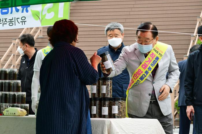 충남 홍성군이 최근 (사)홍성군지역발전협의회와 함께 코로나19 여파로 판로를 잃은 농가의 어려움을 해소하기 위해 드라이브스루 방식의 농특산물 직거래 할인 판매행사를 열어 3000만원의 판매고를 달성했다. 사진은 행사에 참석한 김석환 군수가 농산물을 둘러보는 모습. (사진제공=홍성군청)