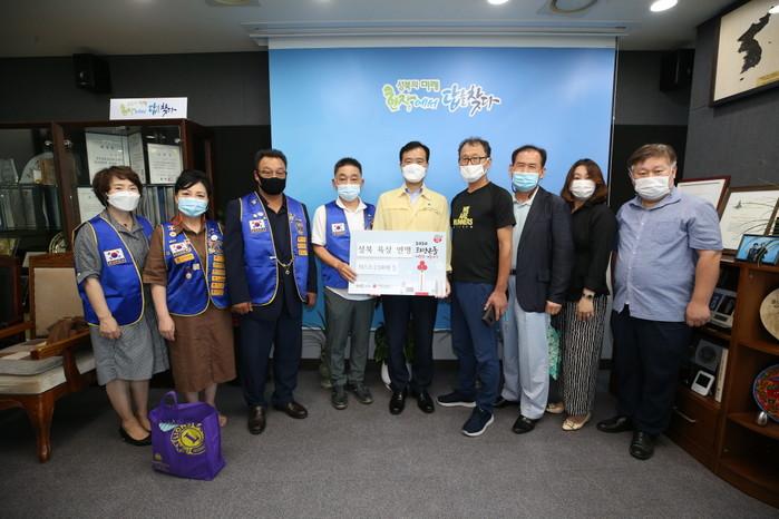 서울 성북구는 2일 성북육상연맹으로부터 지역내 저소득 가구 주민들을 위한 마스크 2500장, 과일음료 100병, 비타민 음료 30상자를 전달받았다. 사진은 전달식에서 이승로 구청장(가운데)과 관계자들이 기념촬영을 하고 있는 모습. (사진제공=성북구청)