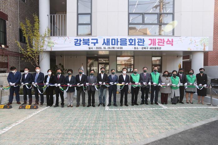 서울 강북구가 지난 10월29일 ‘새마을회관’ 개소식을 진행했다. 새마을회관은 지상 3층, 연면적 398㎡ 규모이며, 건물 내부는 나눔봉사장, 강당 등으로 구성됐다. 사진은 강북구 새마을회관 개소식에 참여한 내빈들이 테이프커팅을 하는 모습. (사진제공=강북구청)