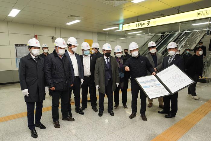 인천광역시의회 건설교통위원회는 5일 '송도달빛축제공원역' 건설 추진상황 점검을 위해 사업 현장을 방문했다. 사진은 의원들이 감리단장과 송도달빛축제공원역 역사 대합실을 시찰하고 있는 모습. (사진제공=인천시의회)