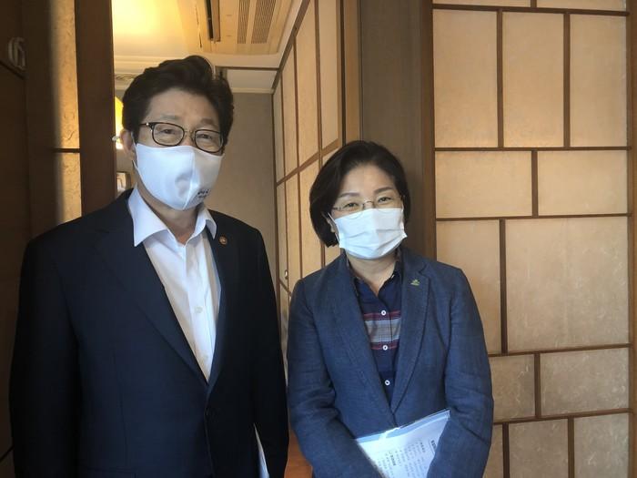 | ▲ 김미경 구청장(오른쪽)이 조명래 환경부장관을 만나 은평구의 환경정책을 논의 했다. (사진제공=은평구청) |