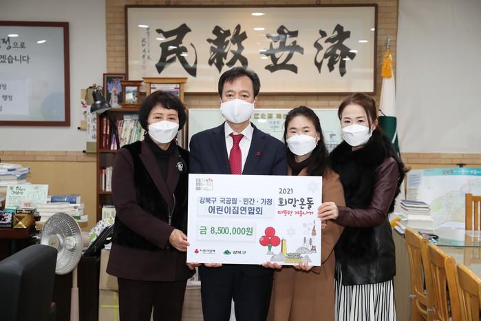 서울 강북구는 지난 15일 국공립어린이집·민간어린이집·가정어린이집연합회로부터 회원들이 자발적으로 모은 총 850만원의 따뜻한 겨울나기 성금을 전달받았다. 사진은 박겸수 구청장(왼쪽에서 두 번째)과 관계자들이 기념촬영을 하는 모습. (사진제공=강북구청)