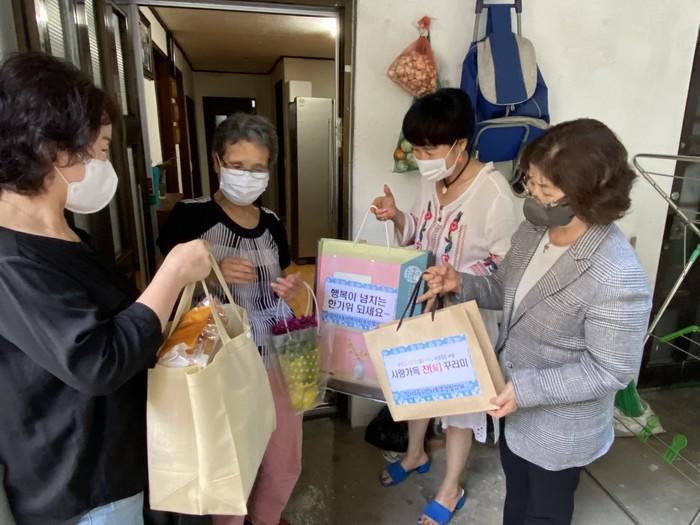 서울 강동구 암사3동 지역사회보장협의체는 최근 추석 명절을 맞아 회원들이 기부한 직접 만든 반찬 및 생활용품으로 제작한 '사랑 가득 찬(餐) 꾸러미'를 저소득층 노인과 중장년 1인 가구에 전달하고 이들의 안부를 살피는 행사를 열었다. 사진은 협의체 회원들이 대상가구를 방문해 꾸러미를 전달하는 모습. (사진제공=강동구청)
