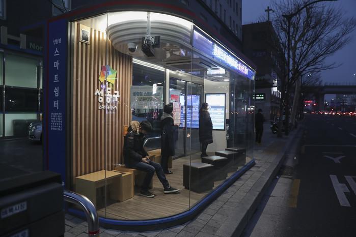 | ▲ 마장축산물시장 버스정류장에 설치된 스마트쉼터에서 대중교통 이용자들이 추운 날씨를 피하고 있다. (사진제공=성동구청) |