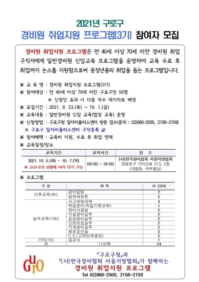 이 프로그램은 경비업법, 범죄예방론 등 이론교육과 사고예방대책, 경비실무, 체포호신술 등 실무교육을 내용으로 10월7일까지 하루 8시간씩 진행된다. 민간경비 교육기관인 (사)한국경비협회 서울지방협회(가마산로 313, 2층)에서 운영될 예정이나, 코로나19 상황에 따라 교육 일정 등이 변경될 수 있다.