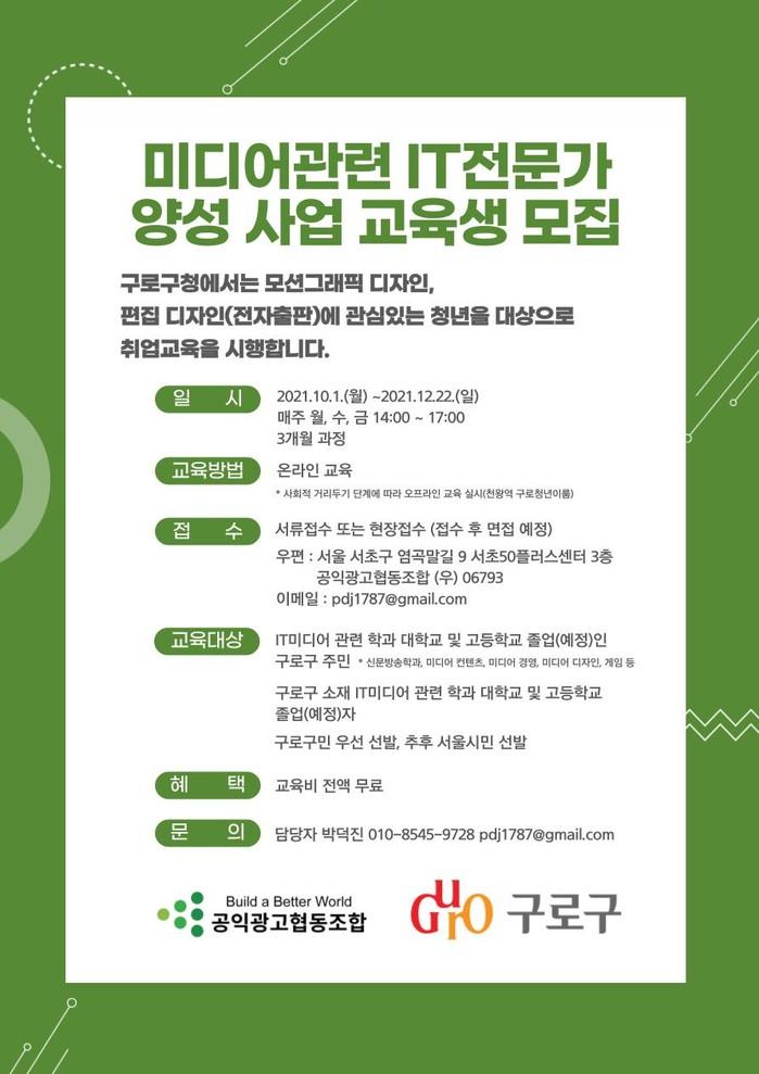모집 대상은 신문방송학과, 미디어 콘텐츠, 미디어 디자인 등 IT 미디어 관련 학과의 대학교나 고등학교를 졸업(예정)한 구로구 주민이나 지역내 소재 IT 미디어 관련 학과의 대학교나 고등학교를 졸업(예정)한 자다. 모션그래픽, 전자출판 편집 분야 각각 10명씩 총 20명 모집한다.