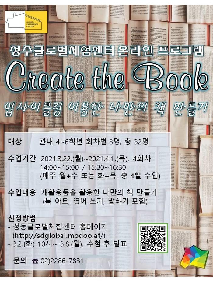 [시민일보 = 홍덕표 기자] 서울 성동구(구청장 정원오) 성수글로벌체험센터가 오는 22일부터 '업사이클링을 이용한 나만의 책 만들기 Create the Book' 온라인 프로그램을 운영한다.