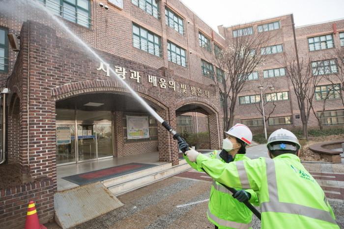 서울 양천구는 지난 23일 학부모 봉사단과 함께 신월3동 양서중학교(양천구 남부순환로 380)에서 물청소를 진행했다. 구는 살수차를 활용해 1~2층 교실 외벽 및 유리창 청소도 함께했다. 사진은 살수차로 외벽을 물청소하는 김수영 구청장의 모습. (사진제공=양천구청)