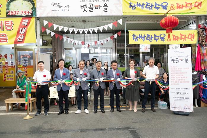 서울 강서구는 20일 화곡1동 중앙골목시장에서 도시재생 사업지 거점공간인 ‘볏골마을’ 개소식을 개최했다. 개소식은 볏골마을 역할 소개, 테이프 커팅식 등으로 진행됐다. 사진은 문홍선 부구청장과 관계자들이 테이프 커팅을 하는 모습. (사진제공=강서구청)