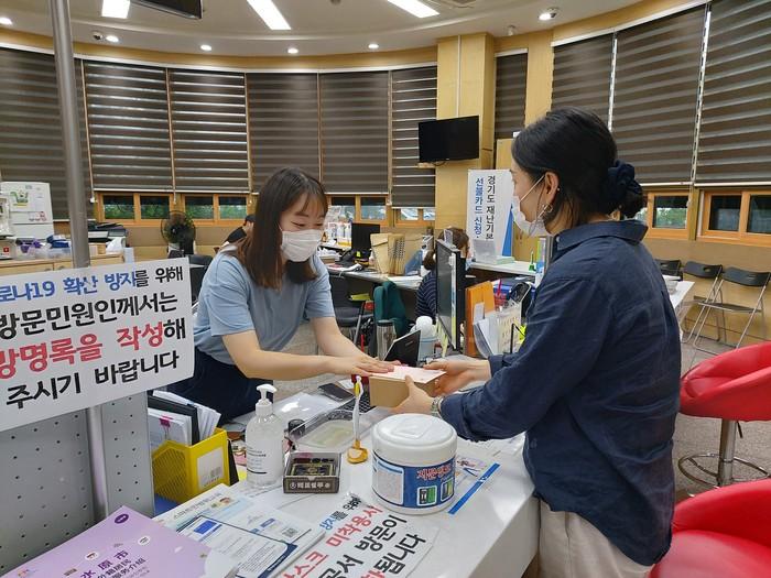 경기 수원시 장안구 조원1동에서는 10일 동 행정복지센터를 방문해 출생신고를 마친 한 아기엄마에게 아기 출생축하카드와 가제손수건 세트를 선물했다. 사진은 축하선물을 받고 있는 아기엄마의 모습. (사진제공=장안구청)