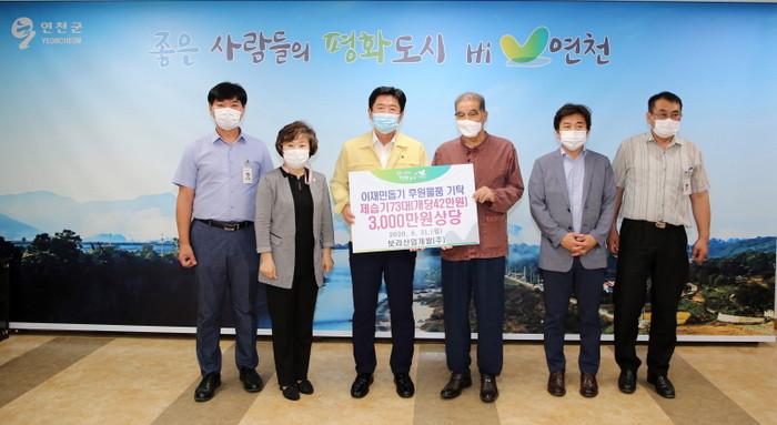 경기 연천군은 31일 보라산업개발(주)로부터 최근 집중호우로 인한 수해 긴급 구호물품인 제습기 73대(3000만원 상당)를 지원받았다. 물품은 군 수해피해 이재민, 임시주거시설 거주민에게 전달된다. 사진은 김광철 군수(왼쪽에서 세 번째)가 기탁식에서 관계자들과 기념촬영을 하는 모습. (사진제공=연천군청)