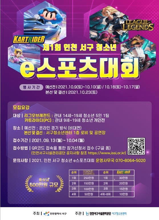 대회 관람은 코로나19 확산에 따른 안전성 확보를 위해 Youtube(서구 청소년 올리고TV) 생중계로 참여할 수 있으며, 다양한 실시간 이벤트를 통해 함께하는 구민들에게 상품권, 치킨 쿠폰 등 다양한 상품이 제공한다.