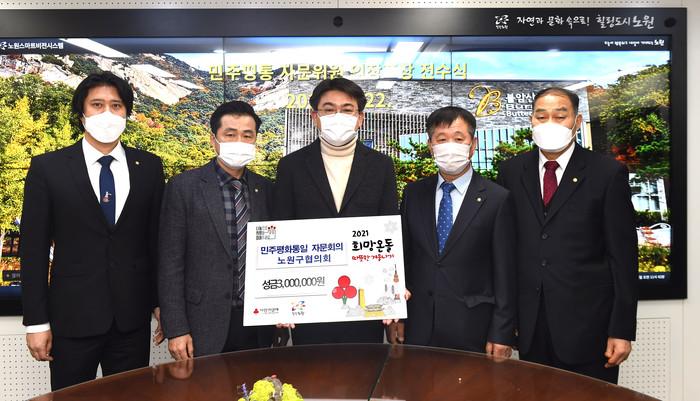 서울 노원구는 지난 22일 민주평화통일자문회의 노원구협의회로부터 따뜻한 겨울나기 기부금을 전달받았다. 협의회는 포상금 100만원과 협의회 성금 200만원을 합쳐 총 300만원의 기부금을 전달했다. 사진은 전달식에서 오승록 구청장(가운데)이 관계자들과 기념촬영을 하는 모습. (사진제공=노원구청)