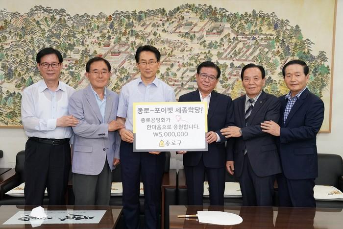 서울 종로구가 최근 종로공영회로부터 ‘종로-포이펫 세종학당’ 조성을 위한 성금 500만원을 기탁받았다. 이 사업은 캄보디아 포이펫 시민들에게 한글과 우리문화를 알리기 위해 추진된다. 사진은 김영종 구청장(왼쪽에서 세 번째)과 관계자들이 기탁식에서 기념촬영을 하고 있는 모습. (사진제공=종로구청)