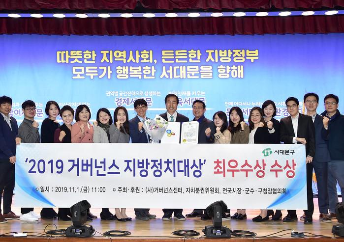 문석진 서울 서대문구청장이 최근 사단법인 거버넌스센터가 주최한 '제1회 거버넌스지방정치대상' 공모대회에서 자치분권을 위한 노력을 인정 받아 '자치분권혁신 분야' 최우수상을 받았다. 사진은 문 구청장(가운데)과 직원들의 기념촬영 모습. (사진제공=서대문구청)