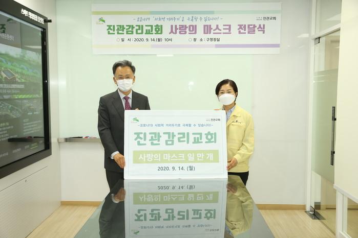 서울 은평구는 지난 14일 진관감리교회(진관2로 123)로부터 코로나19 재확산으로 지친 현장 종사자를 위한 마스크 1만개를 기탁받았다. 사진은 이날 전달식에서 김미경 구청장(오른쪽)과 관계자가 기념촬영을 하는 모습. (사진제공=은평구청)