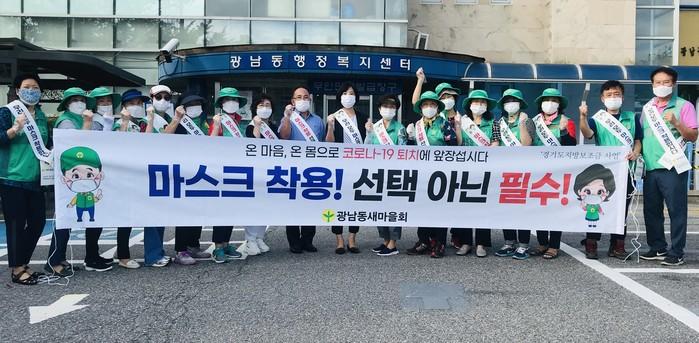 경기 광주시 광남동 새마을협의회는 지난 1일 광남동행정복지센터 앞에서 새마을 남·녀 지도자 20여명 참여한 가운데 ‘마스크 착용하기’ 캠페인을 펼쳤다. 사진은 이날 캠페인 참여자들이 기념촬영을 하고 있는 모습. (사진제공=광주시청)