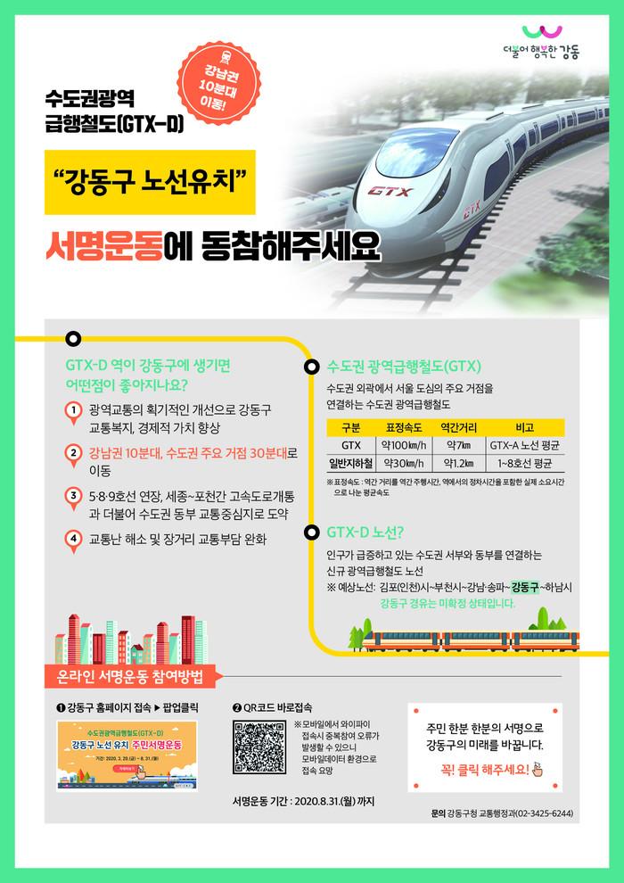 지난 6월 GTX-D 도입 연구용역에 착수해 최적의 노선을 검토하고 있으며, 이달 말까지 서명운동을 확산하고 이후 국토교통부, 서울시에 건의안을 전달하는 등 강동구를 경유하는 GTX-D 노선안이 제4차 국가철도망 구축계획에 반영되도록 온 힘을 쏟을 계획이다.