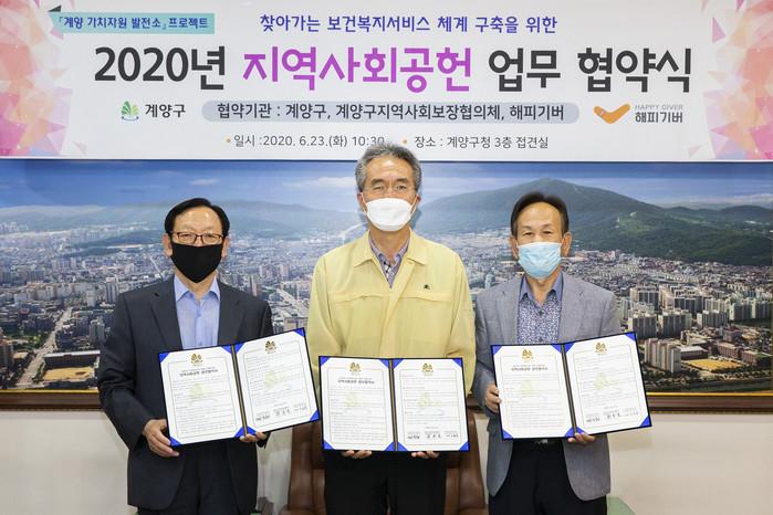 인천 계양구가 23일 구청 3층 접견실에서 구 지역사회보장협의체 및 사단법인 해피기버와 찾아가는 보건복지서비스 체계 구축을 위한 '지역사회공헌' 업무협약식을 열고 취약계층 발굴과 맞춤형 통합서비스 지원에 협력하기로 했다. 사진은 관계자들이 협약서를 들고 기념촬영을 하는 모습. (사진제공=계양구청)