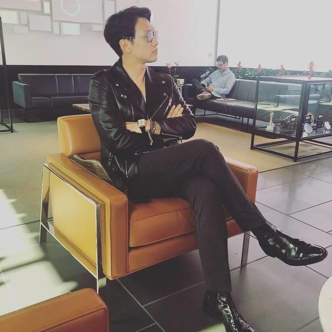 게재된 사진 속 비는 검은 가죽 자켓에 바지, 구두를 착용하고 보잉 선글라스를 채 팔짱을 끼고 소파에 앉아 있는 모습이 인상적이다.