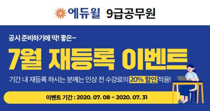 [시민일보 = 여영준 기자] 종합교육기업 에듀윌(대표 박명규) 전국 9급공무원학원이 오는 31일까지 7월 재등록 이벤트를 진행한다. 기간 내 재등록하는 수강생들을 대상으로 인상 전 수강료의 20%를 할인해준다.