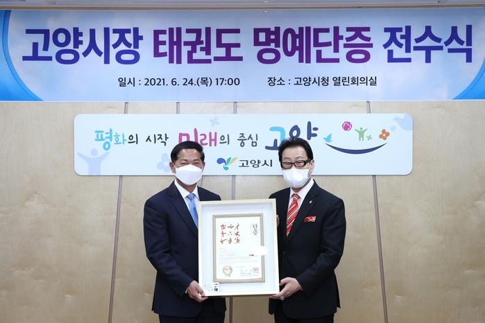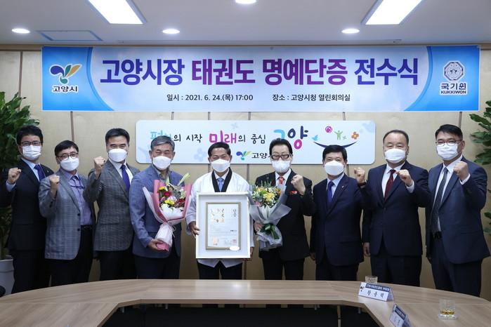 [고양=이기홍 기자] 이재준 고양시장이 지난 24일 고양시청에서 열린 ‘태권도 명예단증 전수식’에서 김경덕 국기원 태권도 9단 최고 고단자회 회장 겸 경기도태권도협회장으로부터 명예단증을 받고 포즈를 취했다.