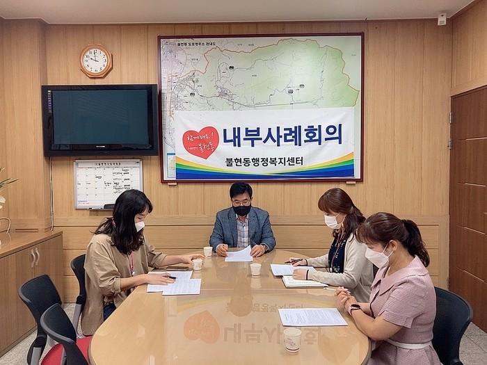 경기 동두천시 불현동 행정복지센터가 31일 내부사례회의를 열고 모(母)의 사망으로 양육 및 일상생활 지원이 필요한 아동과 우울증 및 고용 불안정으로 생계의 어려움을 겪는 가구 등 복합적인 위기상황에 놓인 2가구에 대해 논의를 진행했다. 사진은 이날 회의가 진행되고 있는 모습. (사진제공=동두천시청)