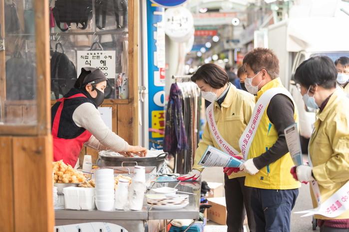 양천구는 최근 우한폐렴(신종 코로나바이러스 감염증) 예방 차원으로 공공시설 및 다수의 주민이 이용하는 시설에서 민관합동 방역 및 캠페인을 실시했다. 사진은 김수영 구청장(오른쪽 세 번째)과 관계자들이 전통시장을 점검하는 모습. (사진제공=양천구청)