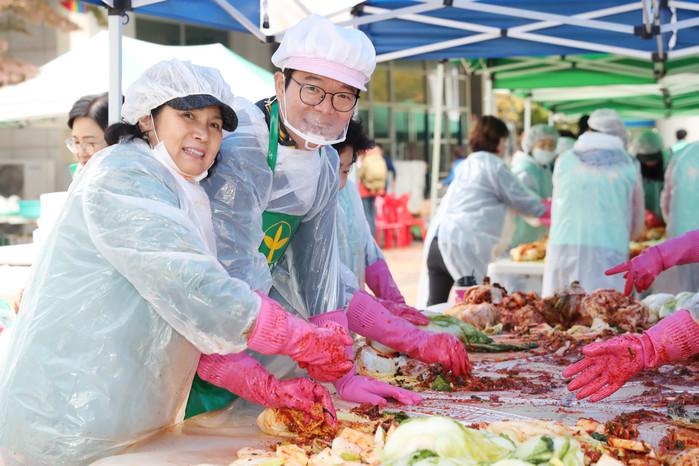 성동구는 14일 ‘김장김치 나누기 릴레이’ 행사를 개최했다. 담근 김치는 기초생활수급자, 차상위계층, 북한이탈주민 및 복지사각지대 대상자 등 지원이 필요한 대상자들에게 배분될 예정이다. 사진은 행사에 참석한 정원오 구청장(오른쪽) 모습. (사진제공=성동구청)