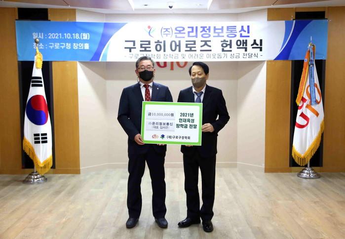 서울 구로구가 최근 (주)온리정보통신의 ‘구로히어로즈 명예의 전당’ 헌액식을 개최했다. 이날 행사에서 (주)온리정보통신은 사회복지공동모금회에 성금 2000만원을, 구로구장학회에 장학금 1000만원을 전달했다. 사진은 헌액식에서 이성 구청장(오른쪽)과 김서규 대표가 기념촬영을 하는 모습. (사진제공=구로구청)