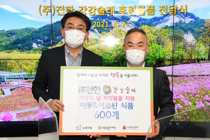 서울 노원구는 27일 (주)전한·강강술래로부터 가정의 달을 간편식세트 노인용(소불고기·곤드레밥·한우된장찌개) 300개와 아동용(돼지양념구이·김치볶음밥·소고기무국) 300개를 전달받았다. 사진은 전달식에서 오승록 구청장(왼쪽)과 관계자가 기념촬영을 하는 모습. (사진제공=노원구청)