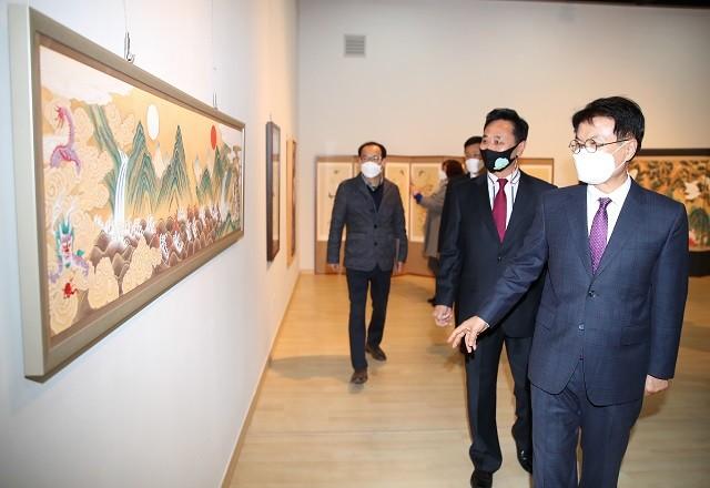 | ▲ 이승옥 강진군수(오른 쪽)가 지난 14일 강진군 아트홀 전시실에서 열리고 있는(14일~ 20일까지) 강진민화협회(회장 양영식) 세 번째 회원전 ‘청자골 색을 머금다’ 주제 전시장을 찾아 전시된 민화작품을 감상하고 있다. / 강진군 제공 |