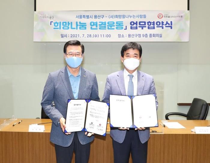 서울 용산구와 (사)희망을나누는사람들이 28일 ‘희망나눔 연결운동’ 업무협약을 맺었다. 협약 목적은 저소득 취약계층 아동·청소년 지원으로 양 기관은 지역내 장학생을 25명 선발해 장학금·컴퓨터 등을 전달하기로 했다. 협약기간은 2년이다. 사진은 협약식에서 성장현 구청장(왼쪽)이 김정안 회장과 기념촬영을 하는 모습. (사진제공=용산구청)