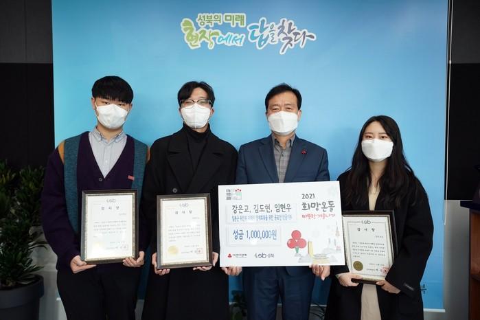 서울 성북구는 23일 '2020 일본군 위안부 피해자 명예회복을 위한 학술심포지엄 공모전'에서 우수팀의 영예를 안은 고려대학교 강은교·김도현·임현우 학생으로부터 어려운 청소년들을 위해 써달라며 대회 수상금에 개인 성금을 보탠 기부금을 전달받았다. 사진은 이승로 구청장(오른쪽에서 두 번째)과 학생들이 기념촬영을 하는 모습. (사진제공=성북구청)
