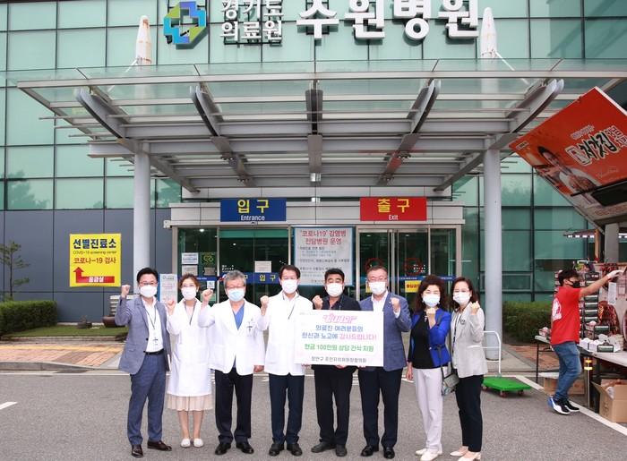 경기 수원시 장안구 주민자치위원장협의회는 최근 코로나19 최일선에서 헌신하고 있는 경기도의료원 수원병원 의료진과 장안구보건소 직원들에게 간식(150만원 상당)을 지원하며 응원의 마음을 전했다. 사진은 전달식에서 관계자들이 기념촬영을 하는 모습. (사진제공=수원시청)