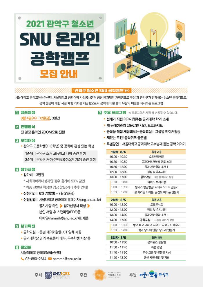 [시민일보 = 여영준 기자] 서울 관악구(구청장 박준희)는 서울대학교와 함께 진행하는 '2021 청소년 SNU 온라인 공학캠프' 참여자를 모집한다고 14일 밝혔다.