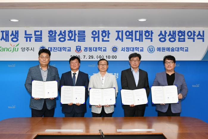 경기 양주시가 29일 시청 상황실에서 도시재생 뉴딜사업의 성공적인 추진과 지역 거버넌스 기반 구축을 위해 대진대·경동대·서정대·예원예술대와 업무협약을 체결했다. 사진은 협약식에 참석한조학수 부시장(가운데) 및 관계자들이 기념촬영을 하는 모습. (사진제공=양주시청)