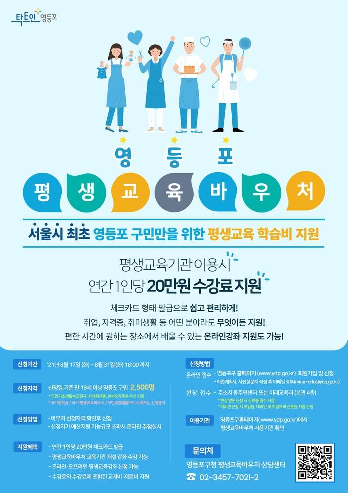[시민일보 = 여영준 기자] 서울 영등포구(구청장 채현일)는 오는 9월부터 서울시 자치구 최초로 만 19세 이상의 구민들에게 평생교육 학습이 가능한 20만원 상당의 바우처(카드)를 지급한다고 29일 밝혔다.