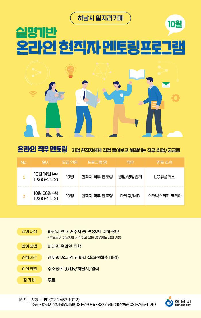 [하남=전용원 기자] 경기 하남시는 일자리카페 취업지원서비스의 일환으로 오는 10~11월 중 월 2회 ‘언택트 현직자 멘토링 프로그램’을 운영한다고 23일 밝혔다.