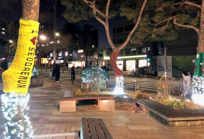 | ▲ 지난해 12월 구 재능나눔 자원봉사단원들의 손뜨개 옷을 입은 구청 앞 광장 나무들의 모습. (사진제공=서대문구청) |
