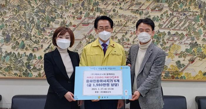 서울 종로구가 최근 (주)에보소닉으로부터 지역 노인들의 복지 증진을 위한 의료기기를 전달받았다. 사진은 전달식에서 김영종 구청장(가운데)이 관계자들과 기념촬영을 하는 모습. (사진제공=종로구청)