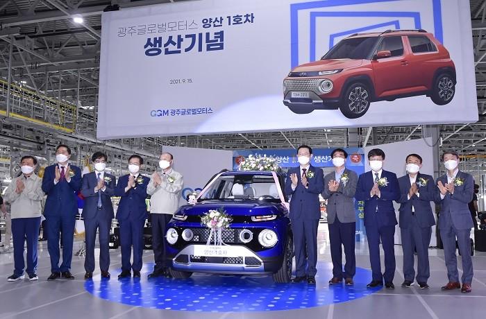 [광주=정찬남 기자] 이용섭 광주광역시장(우측부터 5번)이 15일 오전 광산구 빛그린산단 광주글로벌모터스 조립공장에서 열린 '광주글로벌모터스 양산 1호차 생산' 기념행사에 참석해 김용집 시의회 의장, 박광태 GGM 대표이사, 공영운 현대차 사장 등 내빈들과 기념촬영을 하고 있다.